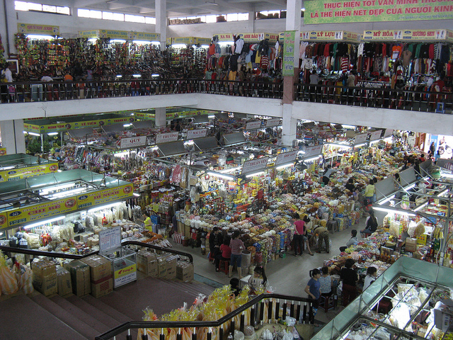 한 강변에 있는 재래시장으로 프랑스식민 통치 시절인 1940년대부터 현재까지 자리를 지키고 있습니다.1층에는 식료품과 채소, 과일을 판매하고 노점과 식당도 볼 수았습니다.2층에는 의류, 신발 ,화장품 ,가정용품등을 판매합니다.